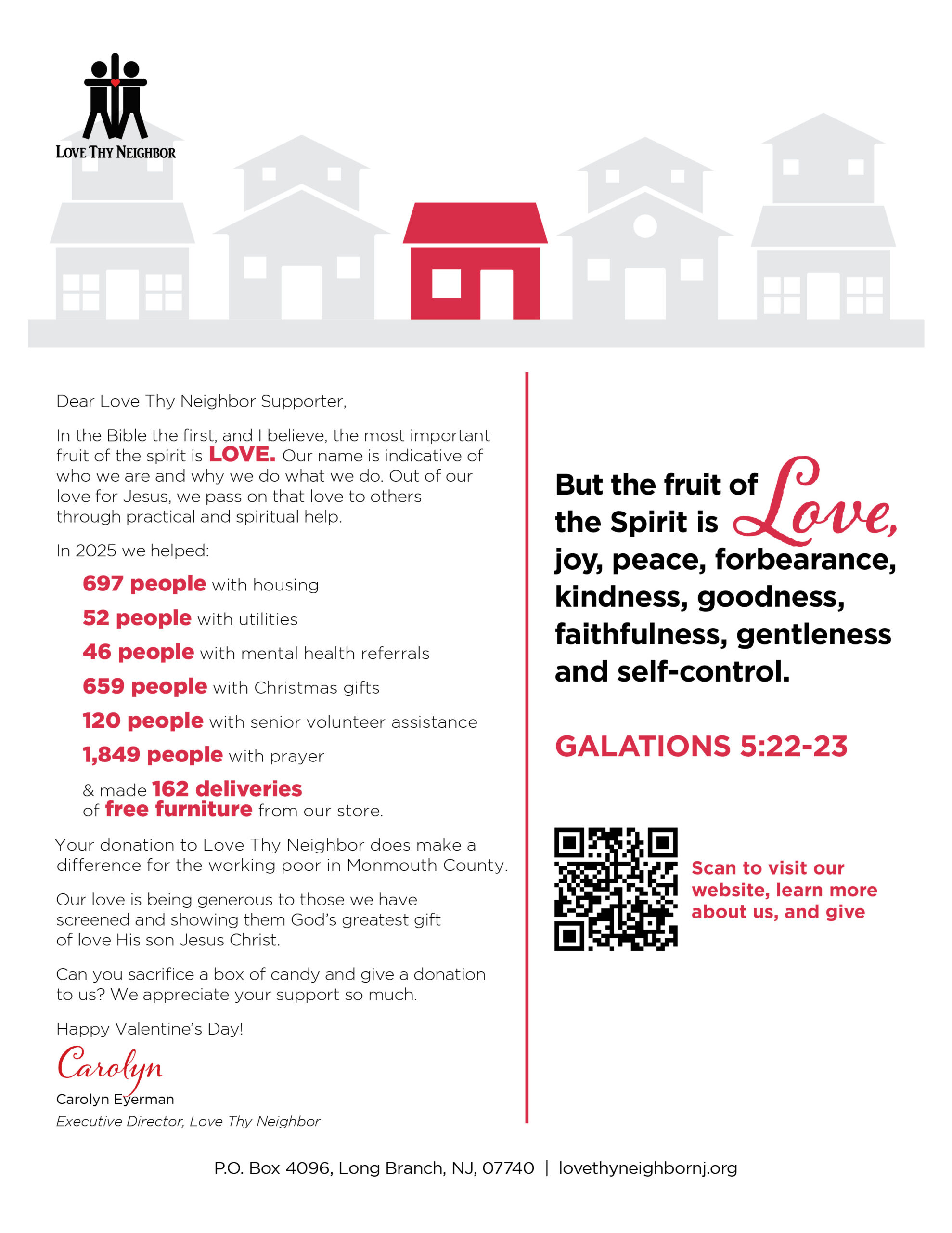 Dear Friends, as you may know, I am the Executive Director of Love Thy Neighbor, a 501(c)(3) non-profit ministry. We are in Crisis Mode when it comes to affordable housing in Monmouth County. We had in 2023, 518 requests for housing assistance in an emergency and we see that their income can support it. When it comes to new housing unfortunately there are no good answers.